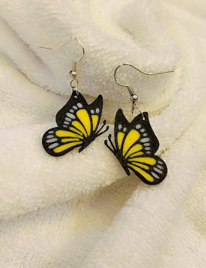 Stunning 3d -printed butterfly earrings in  sleek black with vibrant yellow and white accents & shiny texture .